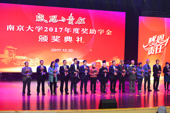 2017年12月10日上午,南京大学“感恩与责任”2017年度奖助学金颁奖典礼在仙林校区恩玲剧场举行,二十余位校董、六十多家设奖单位的颁奖嘉宾,数十家企业代表和社会爱心捐赠人,中科院院士、南京大学校长陈骏,南京大学党委常务副书记杨忠,南京大学副校长薛海林、王志林,南京大学党委常委、宣传部部长王明生,南京大学党委常委、组织部部长郭随平,以及南京大学各部门、院系负责人、师生代表等一千余人出席典礼。
