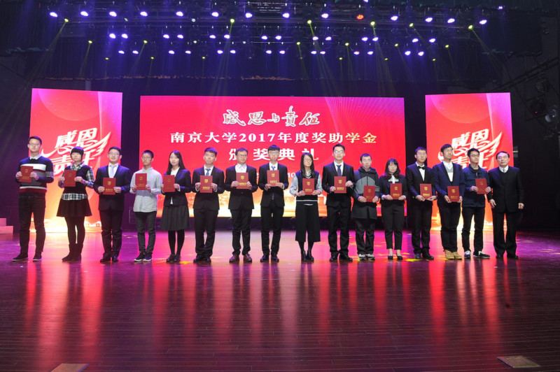 在感恩篇,典礼现场通过一段视频生动展现了南京大学获奖学生代表的风采,随后进行2017年度奖助学金的颁奖。