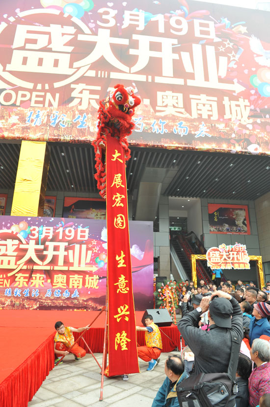 上午10时8分,开业庆典仪式正式开始,集团董事长黄总亲手为舞狮点睛、派发红包,祝愿东来·奥南城商家生意兴隆、财源广进、吉祥如意,来自岱山社区的当地居民、奥南城商家以及客户代表约1000多人参加开业庆典活动。