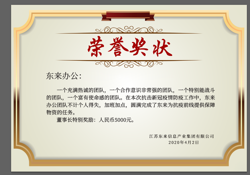 在抗击新型冠状病毒感染的肺炎疫情的战斗中,东来办公的全体同仁,假日无休,冒着风险,完成各合作医院的防疫物资供应,为此,集团决定即时表彰东来办公全体员工特别嘉奖,并奖励现金5000元。